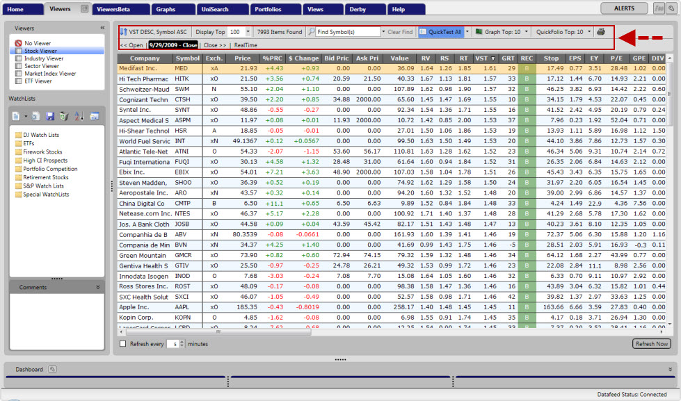 The toolbar for all the VectorVest Viewers is located at the top of the Viewers screen, and is referred to as the Local Toolbar. The Local Toolbar has many options and will allow you to select the time and date, find stocks, print, QuickTest, graph, sort, and more in just seconds.