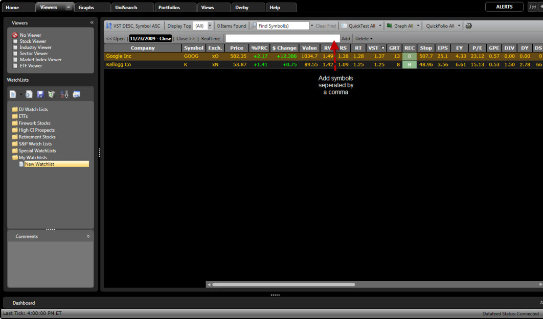 Type the ticker symbols, separated by a comma, into the Add Symbol(s) Window located on the Local Toolbar. If you do not know the symbol start typing the company name and select it from the list that appears.