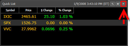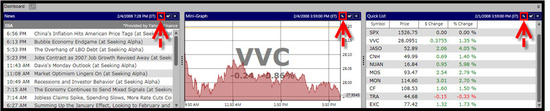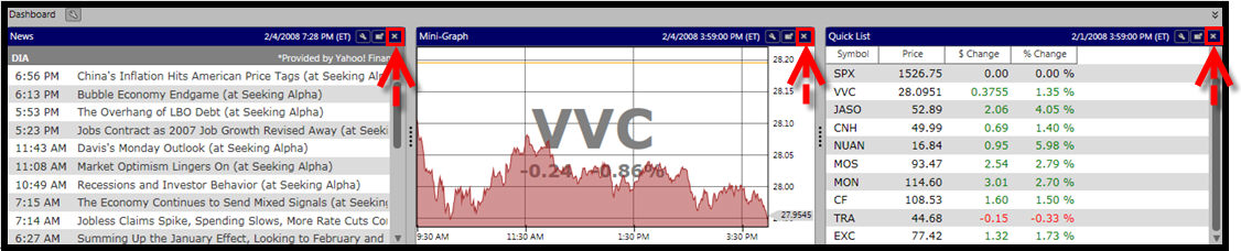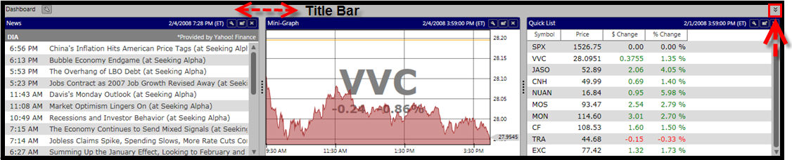 The Dashboard conveniently enables you to access and track up to three items, or Gadgets, at a time while navigating throughout the program. The Dashboard is shown at the bottom of the screen and can be hidden from view with a single click. By default, the RealTime Dashboard will display a Newsfeed of the Top Market Stories from Yahoo! Finance, a MiniGraph of the VVC, and a QuickList tracking the DJI, IXIC, SPX, and VVC. Each of these Gadgets may be customized to your preference or replaced with other available Gadgets. Available Gadgets include: Color Guard, Market Timing Gauge, QuickLists, News, Strategy, Top Items, VectorVest at a Glance, Standard MiniGraph, Advances/Declines, and Portfolio MiniGraph. Click on the Gadget listed to view its description.
