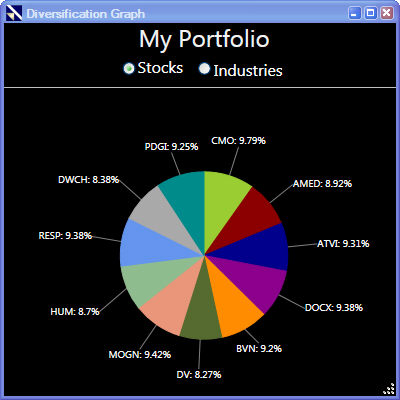 The Diversification Graph is a pie chart that shows the allocation of portfolio resources by stock, or by industry on a percentage basis. The Diversification Graph can also be found in the Portfolio Summary Report.