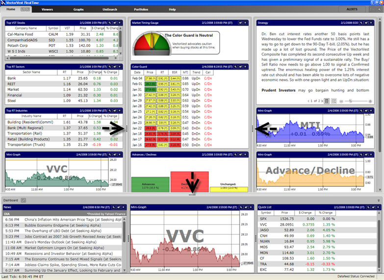 The VectorVest RealTime screen is divided into frames, making it easy to change the viewing area of each frame. The Resizing Handle, a series of five dots, can be found along the edge of each frame. To change the viewing area of a frame, move your cursor over the Resizing Handle (your cursor will change to a double-headed arrow), hold down the left mouse button and move the mouse in the same direction you would like the window frame to move.