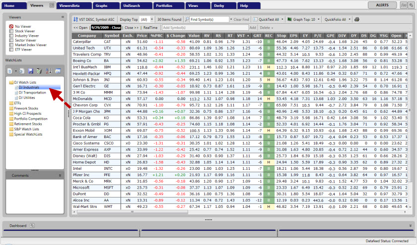 The window will now show the stocks in that WatchList ranked by VST-Vector. These stocks may by sorted, ranked and graphed in the same fashion as Stock Viewer.