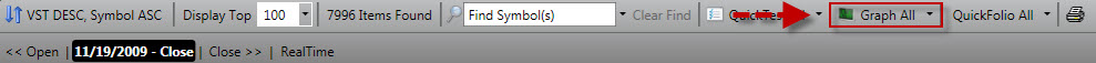 Choosing Select All will graph all the records visible on the Viewer Screen, Graph Selected will only graph the stocks you have tagged, and Graph Top... will graph the number of stocks you have chosen using the selection box.