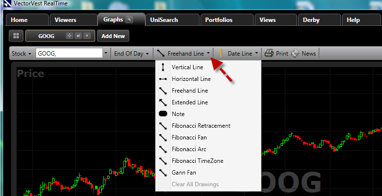 There are several drawing features available in VectorVest RealTime. All drawings will be automatically saved to the graph until deleted.