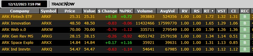 VectorVest subscribers can use the ETF Viewer to obtain the current “Buy, Sell or Hold,” recommendation of the ARK ETFs (see below). This Viewer is located on the 4th tab on top of Home page labelled Viewers. By clicking on it, you can insert the ticker symbols of these ETFs. That produces the results below (I did not include ARK’s two other ETFs — IZRL and PRNT), as I wanted to just focus on the six ARK brand names: