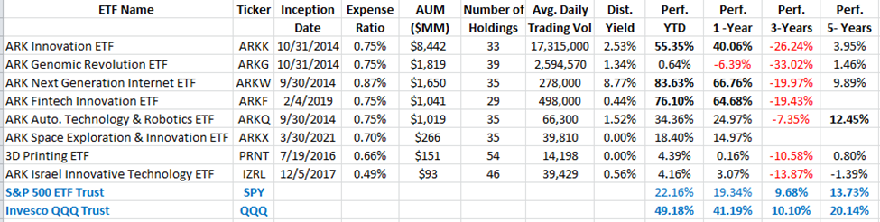 Let’s take another look at more data on these ETFs from ETFAction.com. Here we see that ARKK is the mother lode with $8.4 billion AUM, followed by ARKG at $2.6 billion, and ARKW at $1.65 billion. All these concentrated portfolios are similar in size with 29 to 54 stocks. Four of these ETFs came to market in the Fall of 2014, while the last to market was ARKX in March 2021.