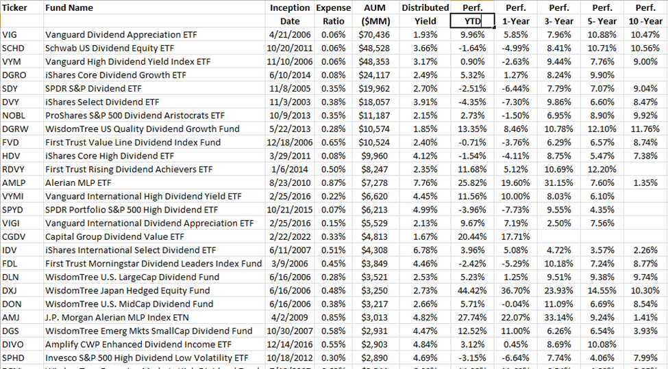 The data for December 1, 2023 shown above provides the top 25 dividend-focused ETFs based on AUM, and was obtained from ETFAction.com. Clearly, there are many choices. But the three ten-year winners were VIG, SCHD, and DGRW with total performance of 10.5%, 10.6%, and 11.8%, respectively.