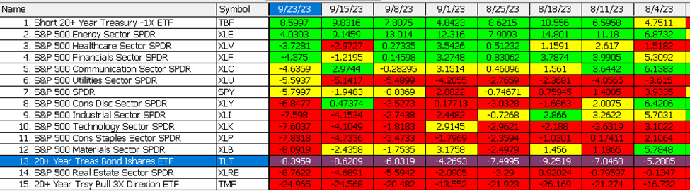 On a more granular basis, the data table below ranks the relative strength (percentage change from the best (green) to worst performers (red) in the Select SPDRs), as well as to S&P 500 (SPY) and two bond ETFs (TLT and TBF for my personal use) each week ending on a Friday market close. The number in the box is the percentage change in price for each ETF for the prior 8 weeks. For example, XLE is up 4.03% since the 8/4 close, while XLRE is down 8.76% in the week ending September 23. The data for September 15 shows the performance for the eight weeks prior to that date.