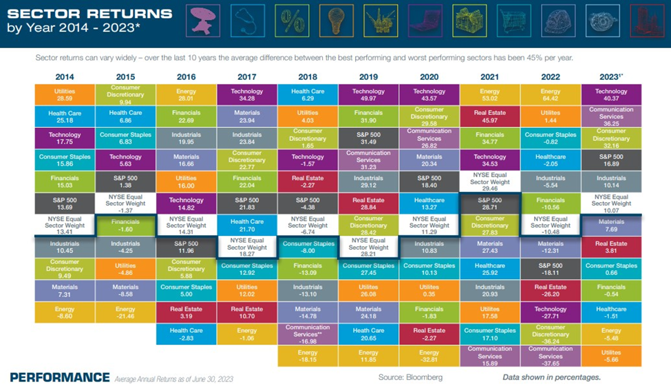 As expected, the performance of the S&P sectors varies widely on a week-to-week, month-to-month and especially year-to-year basis. The table below depicts SSgA’s Select SPDR yearly performance from 2014 through June 2023. Each ETF was assigned a different color. As you can see the top and bottom performers keep changing each year.