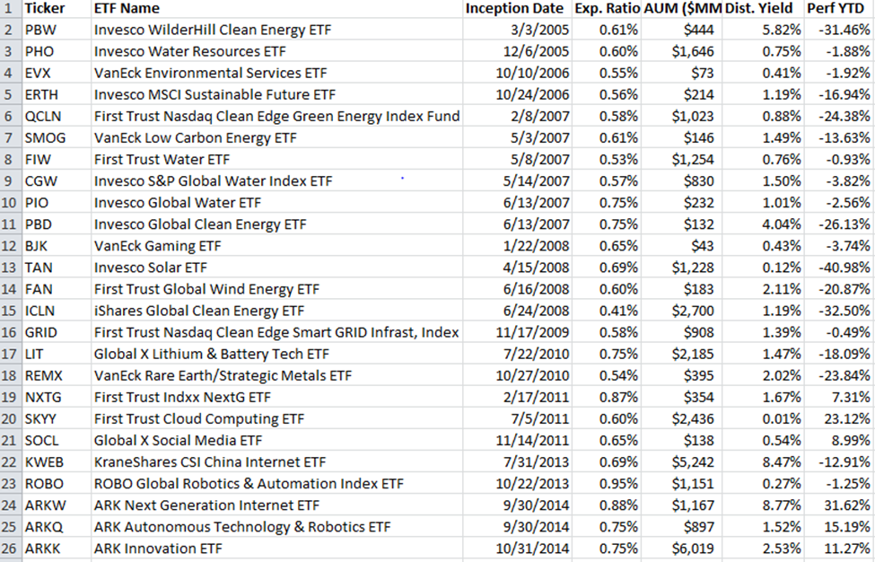 Clearly, some of the ETFs have failed to build their AUM such as EVX, BJK, and SOCL while a few have exceeded the $1 billion mark including PHO, QCLN, FIW,TAN,ICLN,LIT, SKYY, KWEB, ROBO, ARKW, and ARKK. Year-to-date performance has been weak with twenty-six6 losers, and only four winners, not a great showing.