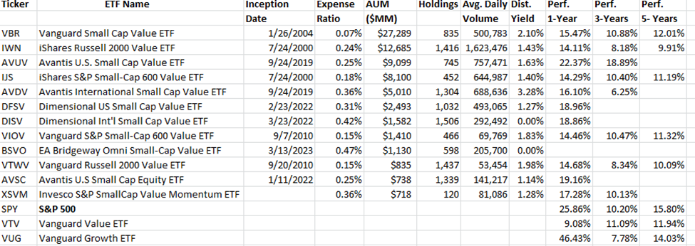 One ETF in particular shows outstanding one- and five-year returns is Avantis U.S. Small Cap ETF (AVUV). Refer to the chart below for its one-year performance view. It had slightly lower returns than the S&P 500, but a higher return that the generic value ETFs VTV and even VUG, the Vanguard Growth ETF that had a phenomenal 2023. This latter ETF got creamed in 2022; therefore its three-year return of only 7.78% is understandable, while AVUV was up almost 19% in three years.