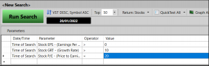 Do you find that you need willpower when it comes to investing? Do you find it frustrating to analyze stock after stock, graph after graph? I’m a gratefully busy person with lots going on and that’s the way I like it too! However, I still want to make smart decisions when it comes to the markets and one of my favorite parts of the VectorVest program is Unisearch because l can direct the system to bring me exactly what I’m looking for. I was talking to a new group of young investors during the week and I asked them for suggestions of stocks that were profitable, growing their earnings by over 10% per annum AND the share price is just twenty times earnings. It’s quite the task! They were googling all sorts, checking their phones, and looking up various apps. After some time elapsed, I opened up VectorVest and built the following search: