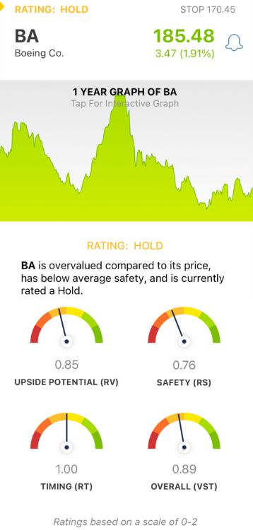Each sits on a scale of 0.00-2.00 with 1.00 being the average, allowing for quick and easy interpretation. You’re even given a buy, sell, or hold recommendation based on the overall VST rating for any given stock at any given time. Here’s what we found for BA right now: