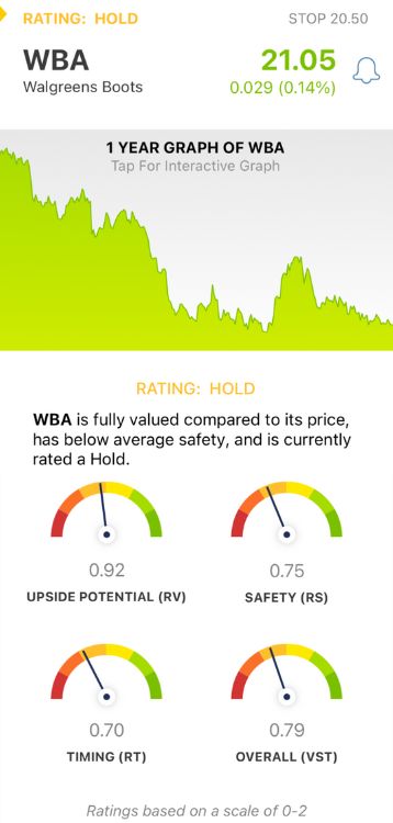 Each sits on its own scale of 0.00-2.00 with 1.00 being the average, making interpretation quick and easy. Better yet, you’re given a clear buy, sell, or hold recommendation for any given stock at any given time based on its overall VST rating. Here’s what we’ve uncovered for WBA:
