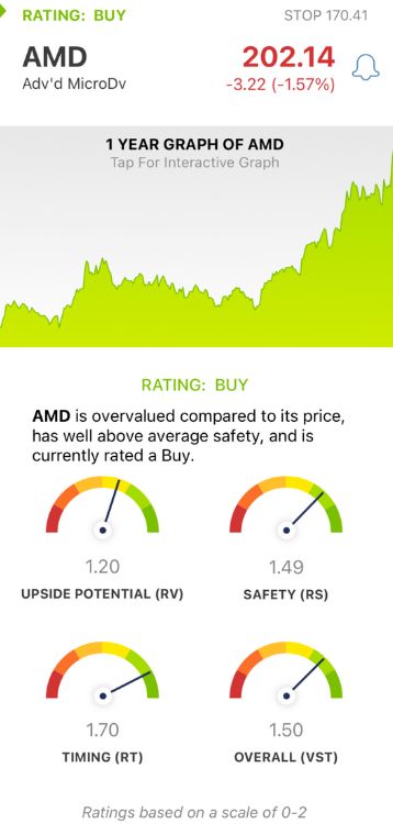Each sits on its own scale of 0.00-2.00 with 1.00 being the average, making interpretation quick and easy. It gets better, though. You’re given a clear buy, sell, or hold recommendation based on the overall VST rating for any given stock at any given time. As for AMD, here’s the current situation: