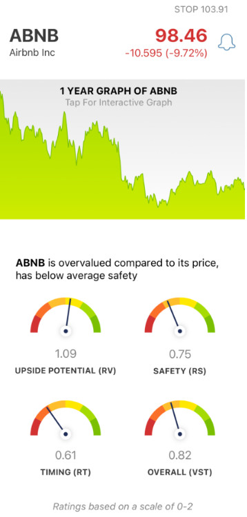- Poor Timing: As you’ll see looking at any time frame within the last year, ABNB has a long-standing negative price trend. And, it’s only been exacerbated over the past few days. This contributes to a poor RT rating of just 0.61 – which is based on the direction, dynamics, and magnitude of the stock’s price movement. VectorVest looks at price trends not just in the short term, but also in the mid-to-long term.