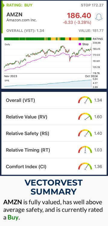 VectorVest has Amazon rated as a "Buy," reflecting the stock’s positive long-term potential, safety, and timing. Here’s a breakdown:
