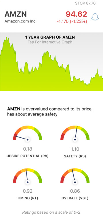 VectorVest advocates buying safe, undervalued stocks, rising in price. Right now, AMZN has very poor upside potential and below-average timing, but it does have good safety.