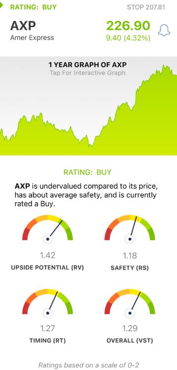 - Excellent Upside Potential: The RV rating compares a stock’s long-term price appreciation potential (forecasted 3 years out), AAA corporate bond rates, and risk. This offers far superior insight than the typical comparison of price to value alone. AXP has an excellent RV rating of 1.42. Further to that point, the stock is undervalued with a current value as high as $294/share.