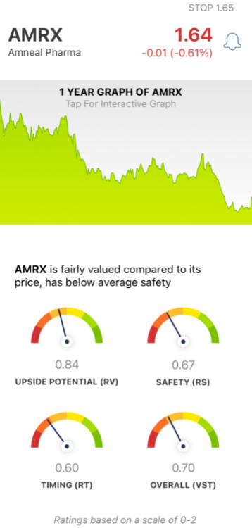- Poor Upside Potential: The RV rating is a far better indicator of a stock’s long-term price appreciation potential than a simple comparison of price and value. That’s because it’s computed based on a 3-year price projection alongside AAA corporate bond rates and risk. As of now, the RV rating of 0.84 is poor for AMRX. But, the stock is fairly valued right now.