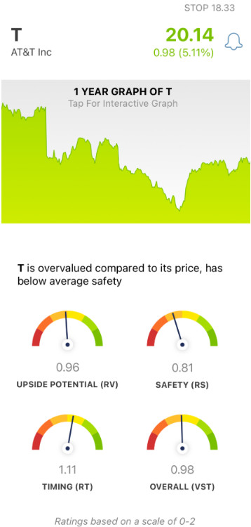 - Fair Upside Potential: The long-term price appreciation potential for T is fair in comparison to AAA corporate bond rates and risk - with an RV rating of 0.96, just below the average. However, the stock is overvalued at the current price per share of $20.14 - with a current value of just $16.57.