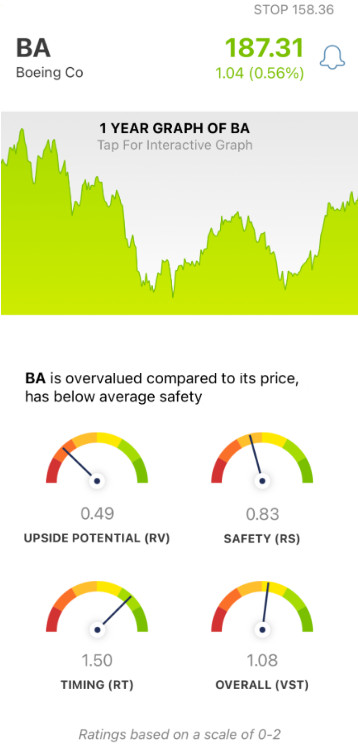 VectorVest advocates buying safe, undervalued stocks, rising in price. As for BA, it is overvalued with very poor upside potential and poor safety, but it does have excellent timing.