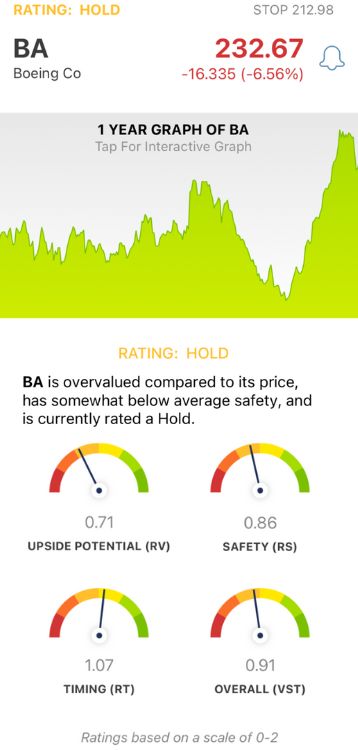 Each rating sits on its own scale of 0.00-2.00 with 1.00 being the average, making interpretation quick and easy. You’re even given a clear buy, sell, or hold recommendation based on the overall VST rating for a given stock. As for BA, here’s the current situation: