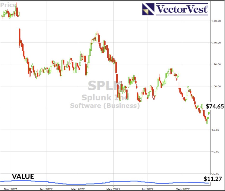 - Poor Upside Potential: While analysts believe SPLK is undervalued at its current share price, the VectorVest system feels the opposite. It deems the stock way overvalued at the current price of $74.65, with a current value of $11.27. Meanwhile, the RV rating of 0.80 is poor – indicating poor long-term price appreciation potential.