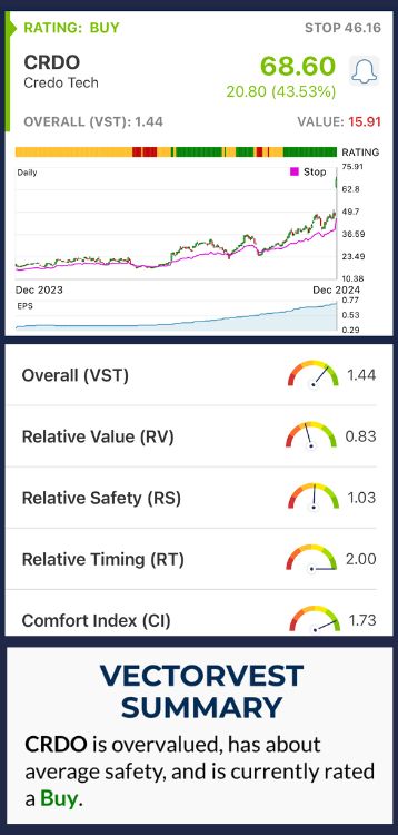 VectorVest advocates buying safe, undervalued stocks that are rising in price. CRDO has shown impressive upside potential, with its stock surging 37% following a strong earnings report. Despite its strong timing, driven by growing demand in the AI sector, CRDO faces challenges related to its relatively low safety score. The company is still navigating a competitive market and is exposed to volatility, which makes it a more speculative investment at the moment. While the growth outlook remains promising, its lower safety and moderate risk require careful consideration for investors.