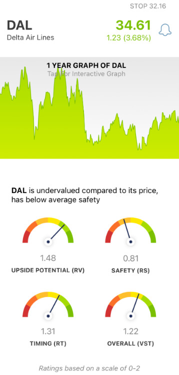 VectorVest advocates buying safe, undervalued stocks, rising in price. As for DAL, it is undervalued with excellent upside potential and very good timing, but it does have poor safety.