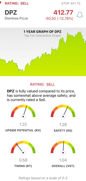 Each sits on a scale of 0.00-2.00 with 1.00 being the average, making interpretation quick and easy. You’re even presented with a buy, sell, or hold recommendation for any given stock at any given time based on its overall VST rating. Here’s what we found for DPZ: