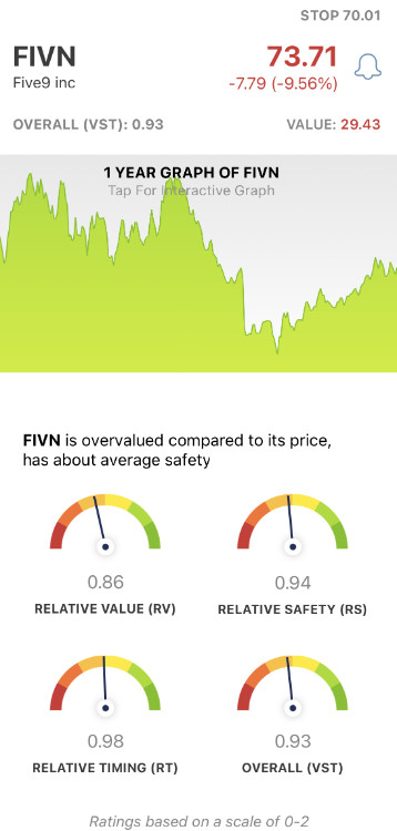 Overall, VectorVest gives FIVN a VST rating of 0.93 - which is fair. Does it earn FIVN a buy in the VectorVest system, though? To get a clear answer on your next move with this stock use our free stock analyzer here.