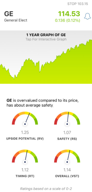 - Fair Safety: In terms of risk, GE is a fairly safe stock - with an RS rating of 1.07. This is calculated through a deep analysis of the company’s financial consistency & predictability, debt-to-equity ratio, and business longevity.