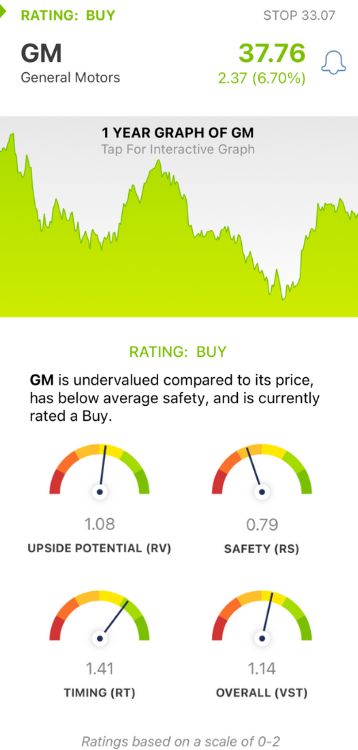 It’s all based on 3 ratings: relative value (RV), relative safety (RS), and relative timing (RT). Each sits on its own scale of 0.00-2.00 with 1.00 being the average. Based on a stock’s overall VST rating, you’re even given a buy, sell, or hold recommendation. As for GM, here’s what you need to know: