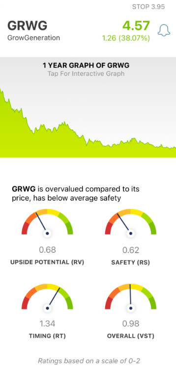 Taking all three of these ratings into account, the overall VST rating for GRWG is just 0.97 – which is fair. But, does it make the stock a buy? Does the very good timing outweigh the 2 red flags of poor upside potential and safety – or is it the other way around?