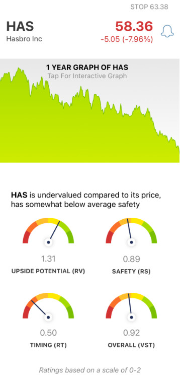 VectorVest advocates buying safe, undervalued stocks, rising in price. As for HAS, it is undervalued with very good upside potential, fair safety, and poor timing.
