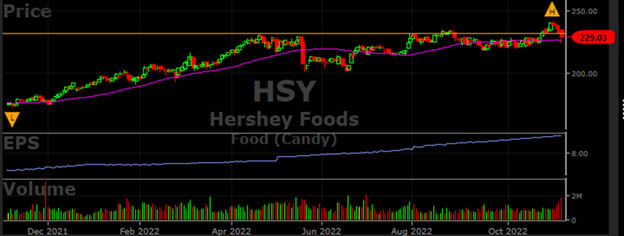 In a bear market, the usual place to turn for reasonable investments is defensive issues like bonds, consumer staples, healthcare and utilities. However many of those choices have not done well, especially bonds which had their worst performance in decades. Food stocks in particular are typically immune to stock price downdrafts. HSY with an 18.9% stock price gain is only one of the 25% of S&P 500 stocks having a positive yearly performance. It also rose 2.4% in the pre-market on Friday. Moreover, the stock reached an all-time high of $240.02 on October 31, although sliding to $229.03 at the Friday close. Stocks making new all-time highs are recommended by many stock market gurus like Dr. Bart DiLiddo, founder of VectorVest, Inc. and William J. O’Neil (founder of Investor’s Business Daily) and well-known trader Mark Minervini, among others. The reason is that these stocks have no former resistance levels to surpass and no former buyers at that level looking to break even.