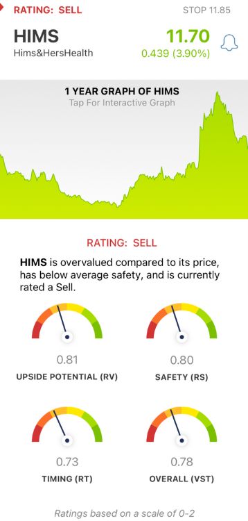 Each sits on its own scale of 0.00-2.00 with 1.00 being the average, making interpretation quick and easy. Better yet, you’re given a buy, sell, or hold recommendation for any given stock at any given time based on its overall VST rating. Here’s what we uncovered for HIMS: