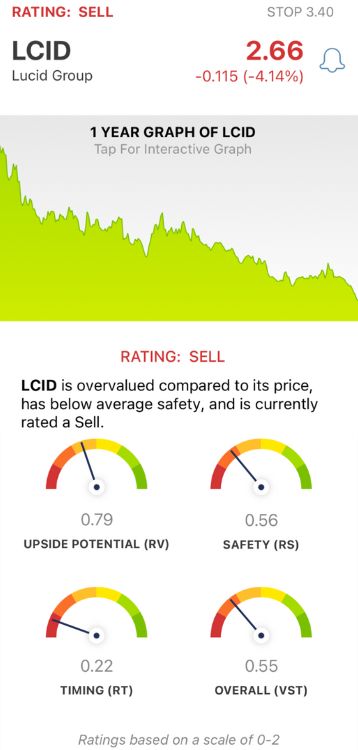 VectorVest advocates buying safe, undervalued stocks, rising in price. LCID is bleeding money on every vehicle it produces while the stock has lost 95% of its value. It has poor upside potential and safety with very poor timing.