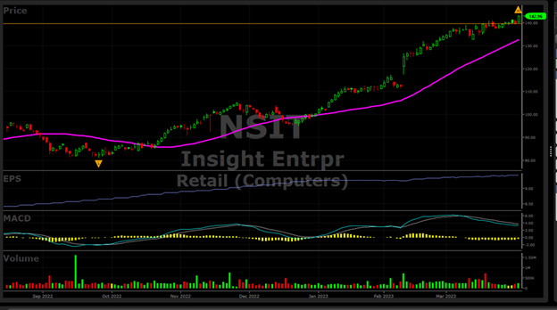 - Excellent Timing: The Relative Timing (RT) rating focuses on the price trend over the short, medium, and long term. The components include price direction, dynamics, and price magnitude of price changes over daily, weekly, quarterly, and yearly comparisons. NSIT has a significantly high RT rating of 1.63 compared to the average 0.91 RT of all the stocks in the database. Interestingly, the chart’s MACD indicator has been is a downtrend since March 9 as the price was in a tight flat trading range, but will likely cross to the upside this week if the stock rallies.
