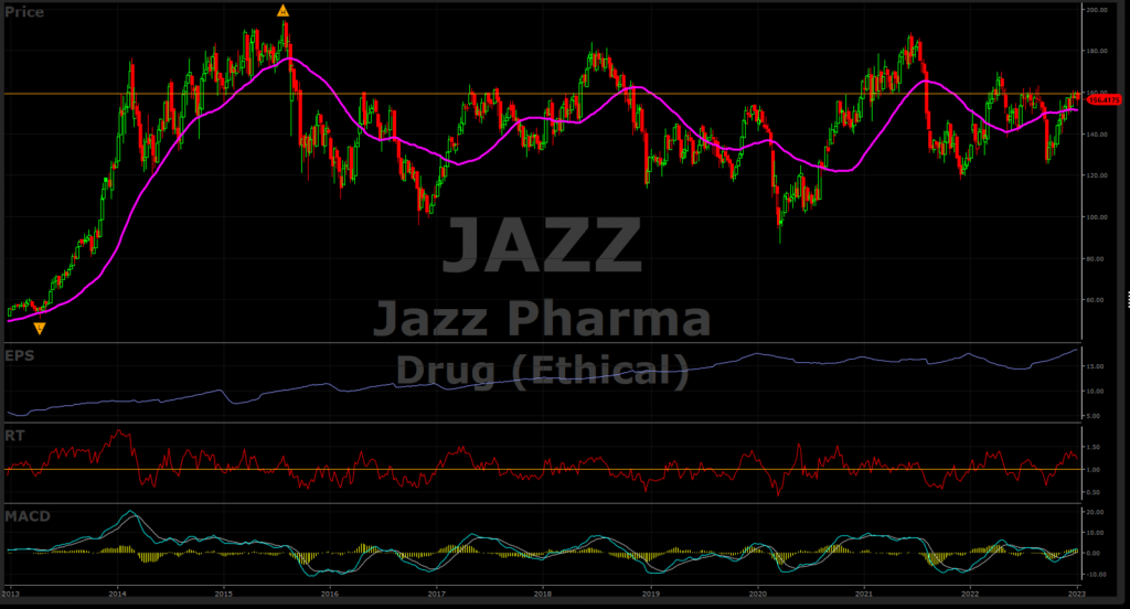 JAZZ’s growth has been expanding for 6 consecutive years and from 2016 through 2021 it has a CAGR of 16%. In November 2022 it raised its total revenue guidance to $3.65 billion. Moreover, in 2021, revenues exceeded $3 billion and the 2025 revenue target is forecasted to hit $5 billion. Also, in 2022 greater than 65% of net product sales were driven by newer products. Earnings- per-share (EPS) have accelerated since mid-year. JAZZ does not provide any dividends at this time.