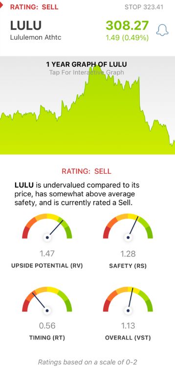 The overall VST rating of 1.13 is good for LULU, but the stock is still rated a SELL for the time being. Take a moment to check out this free stock analysis and learn more about this situation if you’re currently invested in LULU and eliminate human error, emotion, and guesswork from your investment strategy for good!