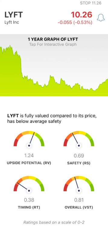 It’s all possible through three simple ratings: relative value (RV), relative safety (RS), and relative timing (RT). These sit on a scale of 0.00-2.00 with 1.00 being the average – making interpretation quick and easy. And based on these ratings, VectorVest issues a clear buy, sell, or hold recommendation. As for LYFT, here’s the current situation: