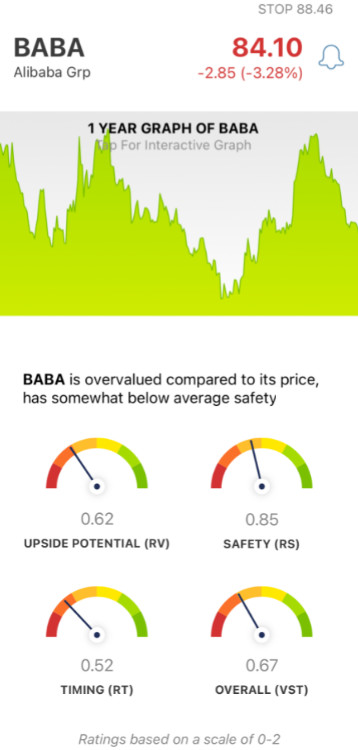 VectorVest advocates buying safe, undervalued stocks, rising in price. Right now, BABA has fair safety, but poor upside potential and timing.