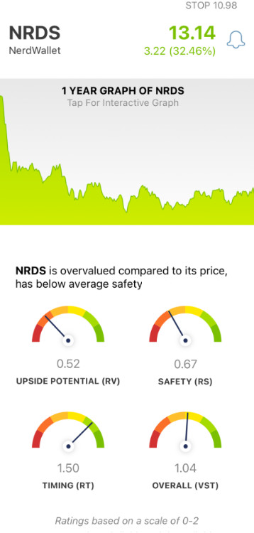 - Poor Upside Potential: An indicator of the long-term price appreciation potential, the RV rating for NRDS is poor right now at just 0.52. Moreover, VectorVest calculates the stock to be overvalued at a current price of $13.14. The current value is just $3.32.