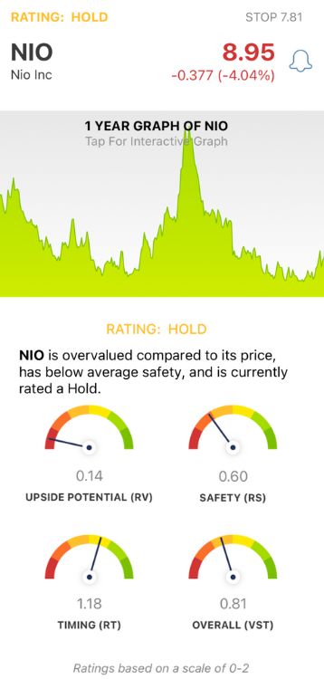 It gets even easier, though. VectorVest offers a clear buy, sell, or hold recommendation for any given stock at any given time based on its overall VST rating. As for NIO, here’s what you need to know: