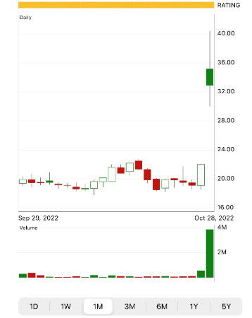 As of 11 AM EST Friday morning, Nuvalent has gained over 50% on its share price. The stock topped out at around $38/share (a 75% gain) but has started to trend back downwards and currently sits at $33/share. What happened to cause this spike?