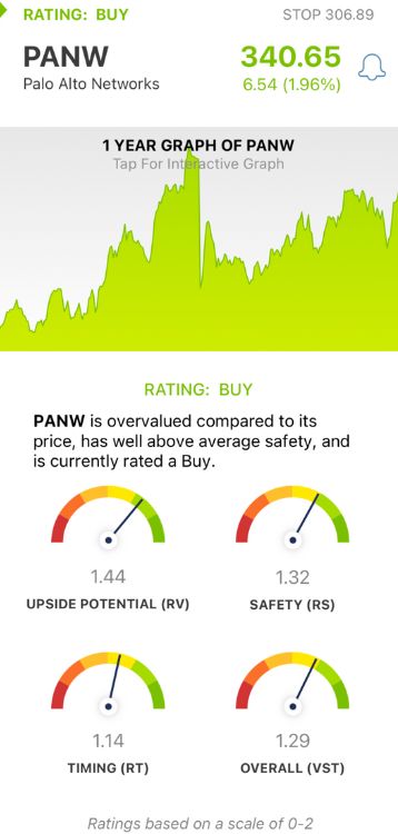 - Excellent Upside Potential: The RV rating compares a stock’s long-term price appreciation potential (forecasted 3 years out), AAA corporate bond rates, and risk. It’s a far superior indicator to the typical comparison of price to value alone. The RV rating of 1.44 is excellent for PANW.