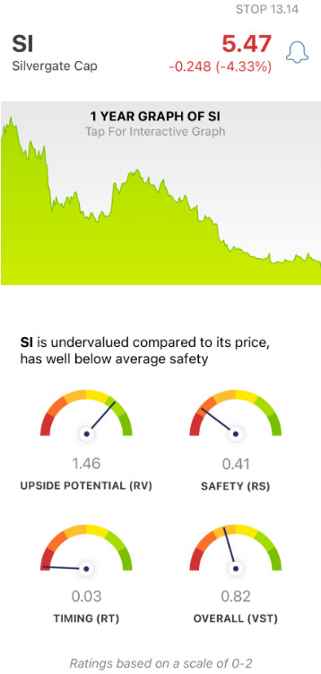 • Very Poor Safety: As you can clearly see from reading any of the news surrounding SI, the company has very poor safety - and the RS rating of 0.41 reflects this. This rating is derived by analyzing the company’s financial consistency and predictability, debt-to-equity ratio, and business longevity - all of which leave much to be desired for SI.