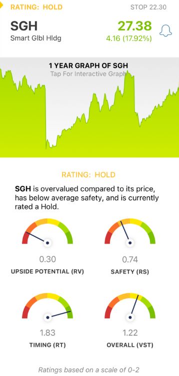 Each sits on its own scale of 0.00-2.00 with 1.00 being the average, allowing for effortless interpretation. It gets even easier, though. You’re given a clear buy, sell, or hold recommendation based on the overall VST rating for any given stock at any given time. Here’s what we found for SGH: